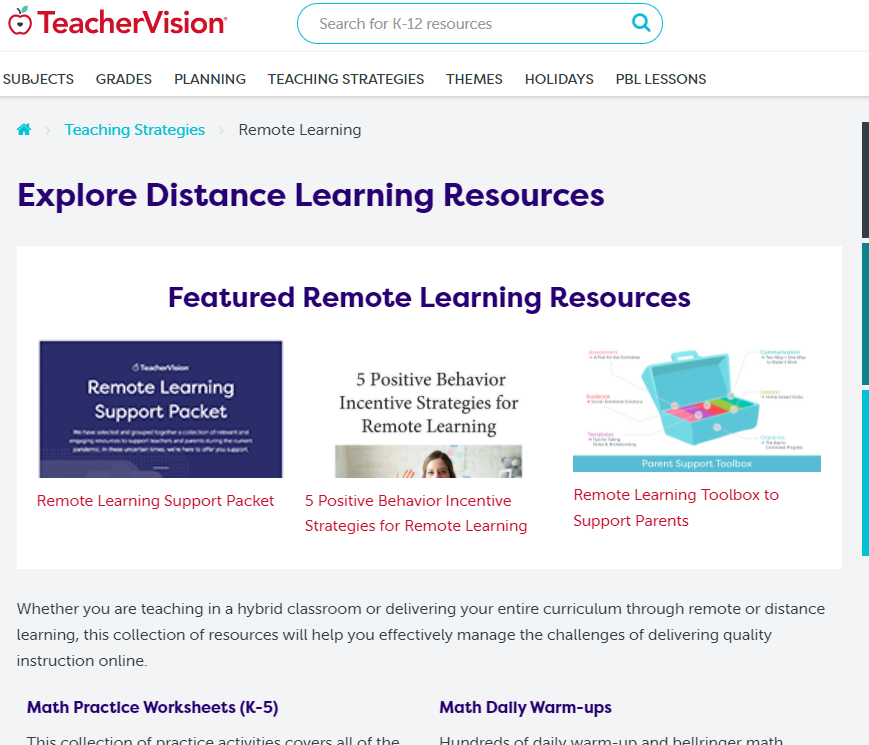 Yes, parents will find many suitable resources on TeacherVision. We recommend browsing under the different subject headings at the top of the screen.